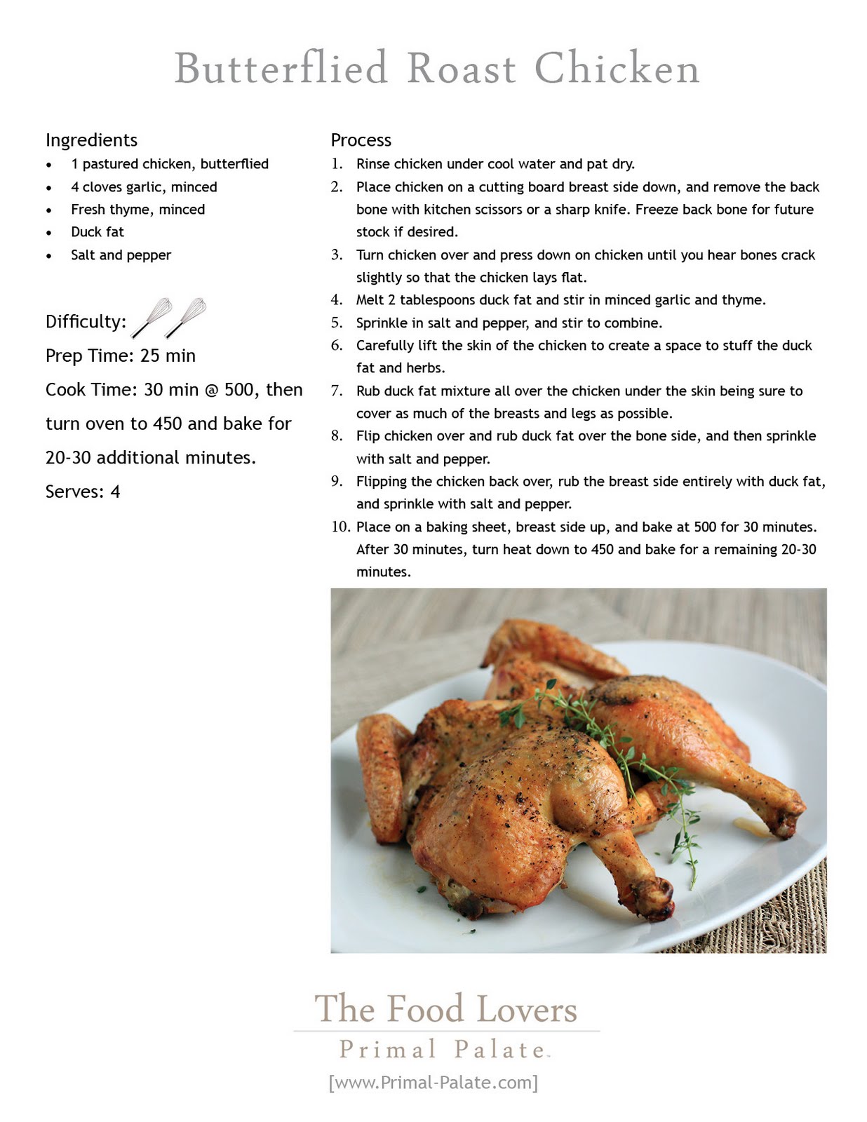 Thanks to Stacy, we’ve been using that duck fat in dishes this fall with great success. We melted down the duck fat and mixed in some of our favorite herbs (thyme and garlic), and created a blissfully simple herb rub for the chicken. To prepare the bird, we butterflied it ala Modern Paleo Warfare’s method: (rated R for violence and adult situations)