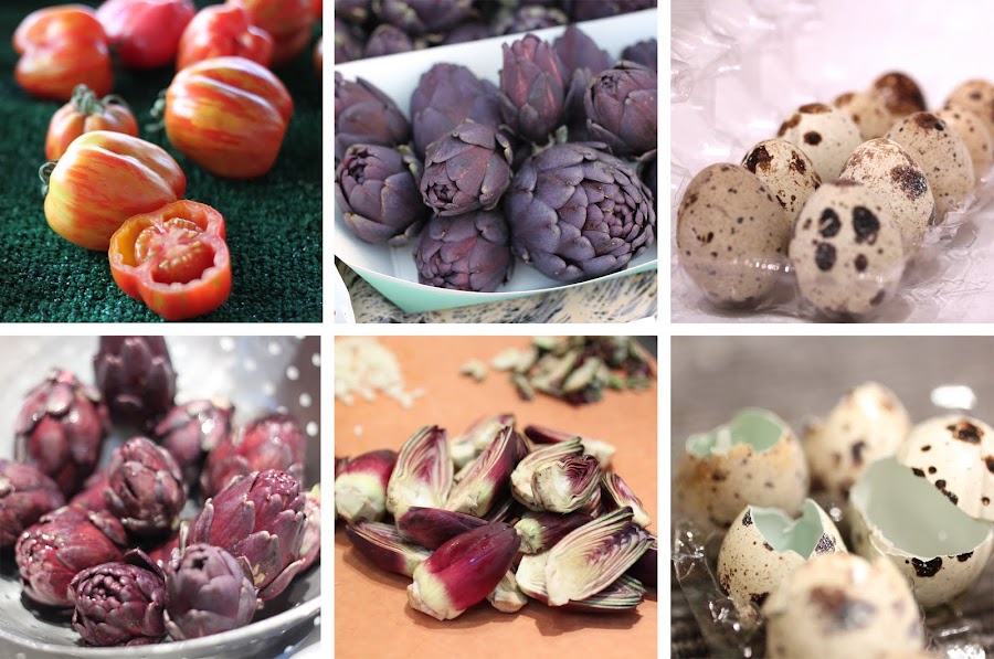 - Plate artichokes and tomato, and top tomato with fried quail eggs.