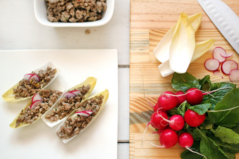 Today’s recipe is a great lunch option, or even appetizer for house guests. We put a new flavor spin on delicious, fatty, ground pork, and served it in endive ‘boats’. Delish! This recipe for ground pork would be great over a salad, or with your eggs the following morning.