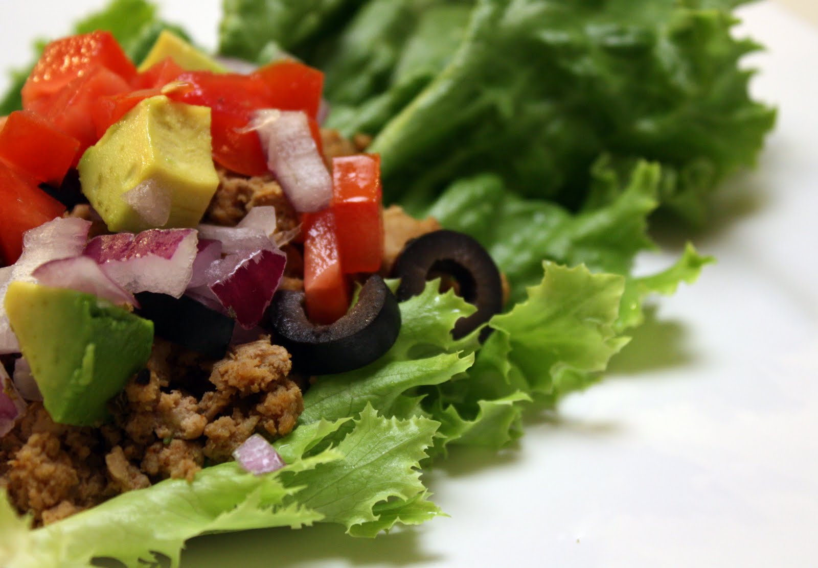 For the taco meat, we went with lean ground turkey. As we’ve said before, you could go with lean ground beef in a dish like this too – its just our personal preference to do turkey. For toppings we went with avocados (a great source of healthy fat), sliced black olives, chopped red onion, and diced tomatoes. Let your taste buds be your guide here – if you can think of something else you’d like to have on top, go for it. Perhaps you could top your taco with some of the guacamole we posted last week! To wrap up the taco itself, we used large leaves of green leaf lettuce, though bibb lettuce would have been great too. This ended up being a great alternative version of the tacos I grew up with, and is sure to please just about anyone. Enjoy!