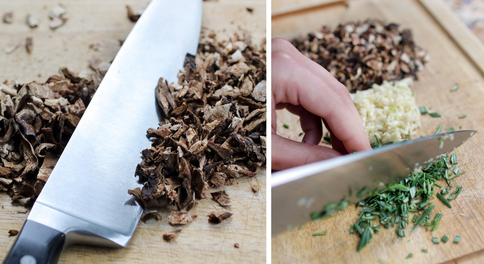 - Combine mushrooms, garlic, rosemary, salt and pepper on cutting board.