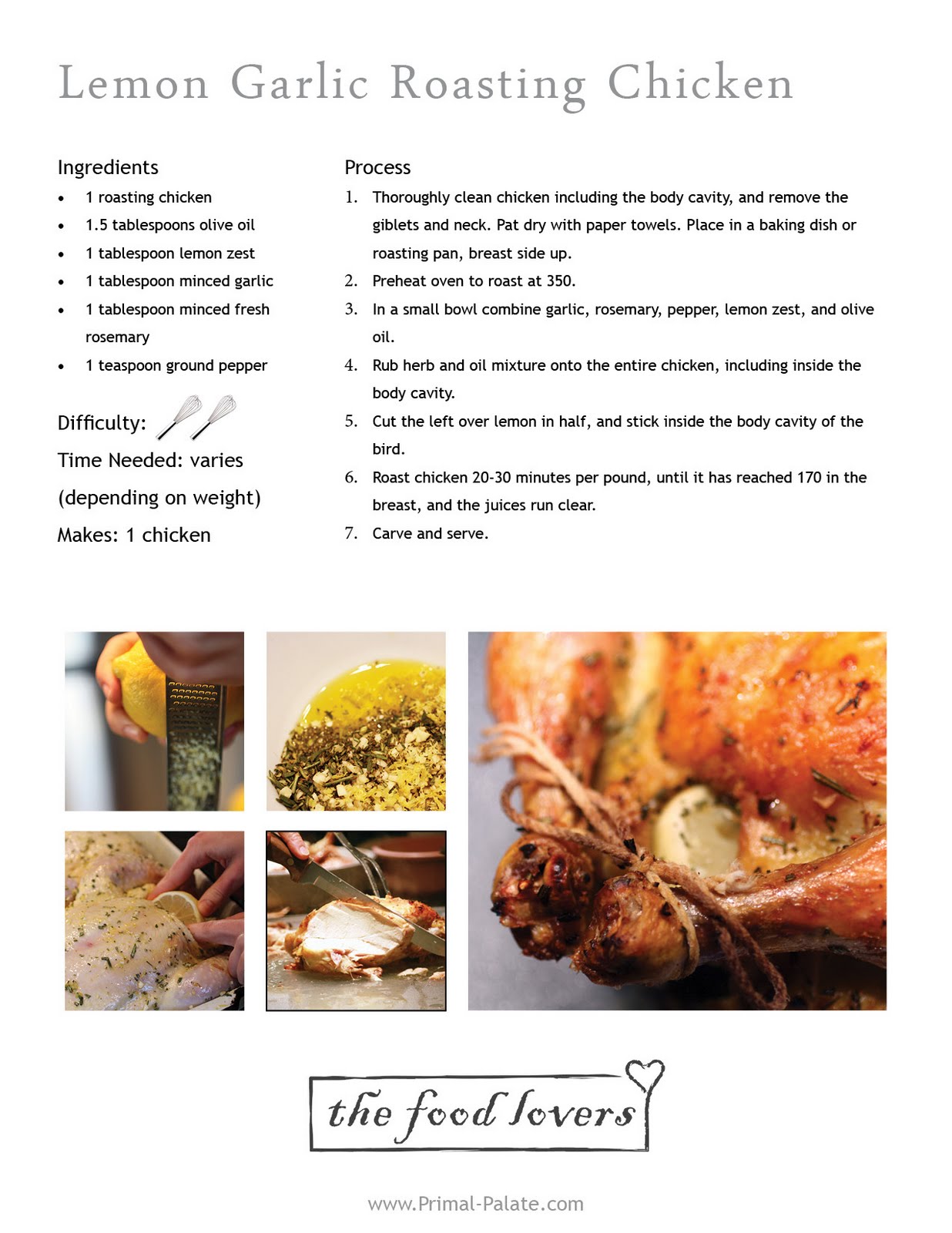 It has been smooth sailing through the Paleo Love 30 day challenge, and after posting three delicious, “gourmet” meals on Monday in support of the challenge, we wanted to follow up with another sexy and yet simple dish. For this recipe we decided on a classic pairing of lemon and garlic, with the addition of fresh rosemary-a great herb to season poultry. There was no need for salt in this recipe, but fresh ground pepper gave the meal the perfect “kick” to finish off the seasoning.