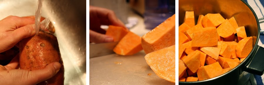 - Peel and cut sweet potatoes, and place in a large soup pot filled with water.