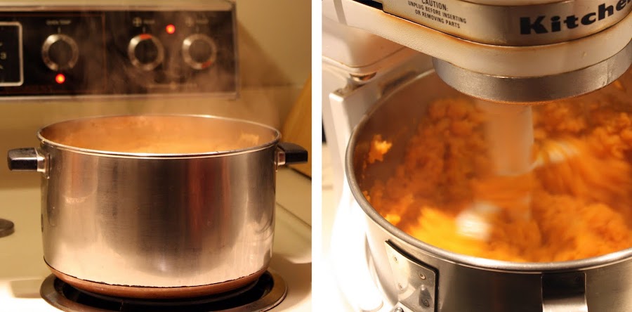 - With kitchen aid mixer, or hand mixer, mash sweet potatoes on low to keep from getting lumpy and “glue-like”.