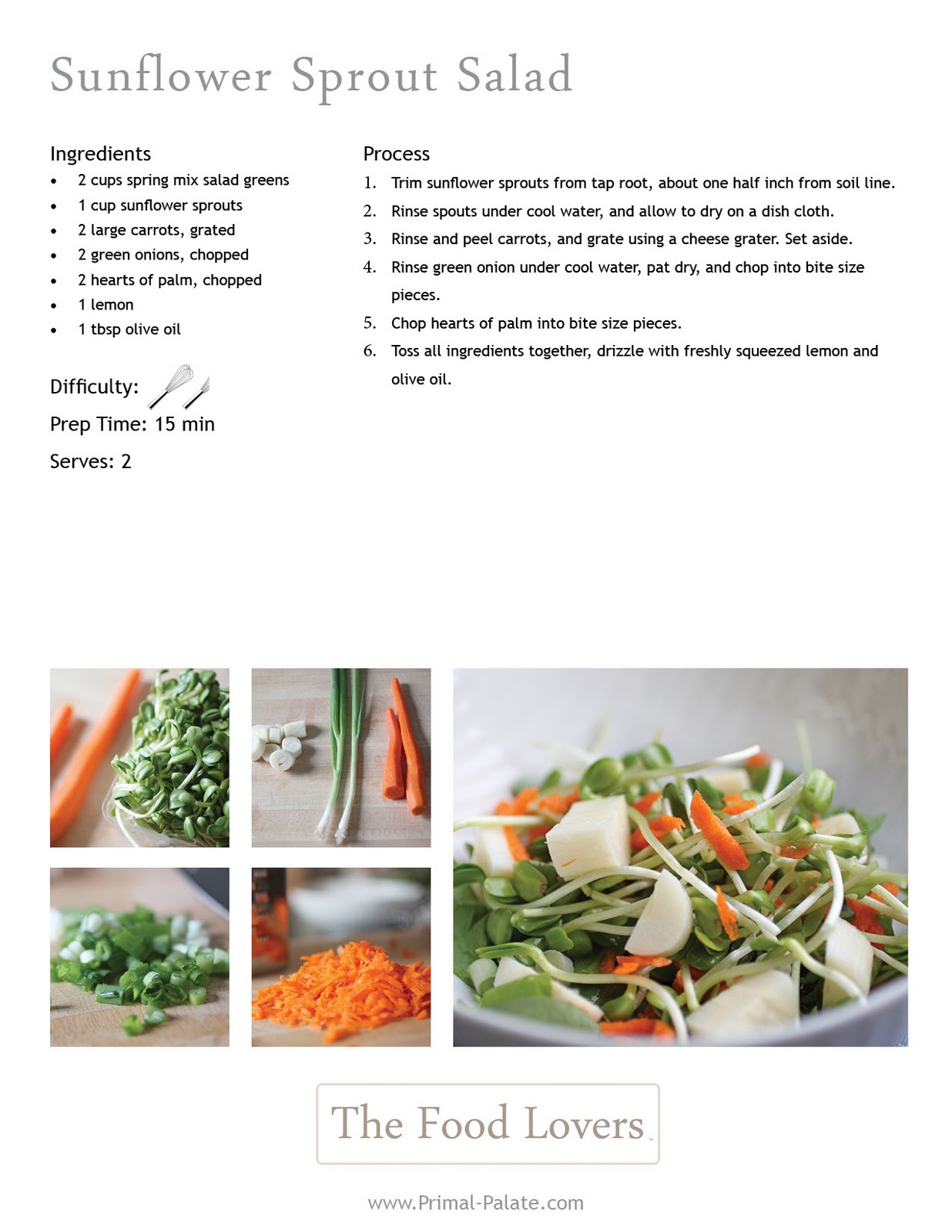 We couldn’t have asked for a better restaurant experience, and our server made sure to tell us that now that they were all aware of the Paleo diet, to let all of our friends know that Legume would love to accommodate Paleo eaters. Along with the wonderful experience we had, I was also deliciously surprised by the sunflower sprouts that were added to my dish. These delicious greens are what inspired the salad we are presenting today, and they even inspired us to grow our own sunflower sprouts.