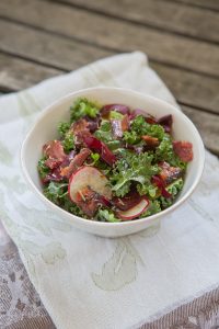 This warm salad is made by tossing kale, radishes, and beets in bacon fat, then drizzling a rosemary dressing overtop. Serve it as a starter, or as a side dish to your favorite entrée.