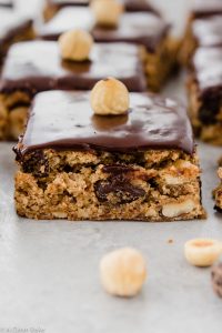 Hazelnut chocolate chip cookie bars are a little something different for your next cookie tray! These bars boast the familiar flavor and chewy texture of a chocolate chip cookie, complemented by fragrant and festive hazelnuts, but are baked into easy-to-serve bars. To make them extra special, cover them with a smooth, rich layer of homemade dairy free chocolate ganache and top each bar with a whole hazelnut!