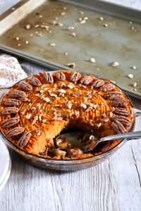 A fun twist on shepherd's pie fit for Thanksgiving dessert. A combination of apples and pecans tossed in spiced maple syrup are topped with mashed sweet potatoes and three ingredient candied cinnamon pecans for a finishing touch. Very lightly sweetened with only 1/4 cup of maple in the filling and another 1/4 cup on the candied pecans.