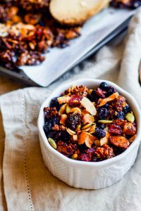 Toasted Coconut and Berry Grain Free Granola! A super simple homemade grain free granola recipe that is paleo, vegan, and tastes so good! An assortment of nuts, seeds, dried berries, spices, coconut oil, coconut, and maple syrup all baked up. That’s it! Perfectly filling and EASY to throw together! Great fuel for you or a gift idea for others.
