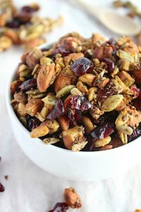 Delicious, nutritious, crisp and crunchy clusters of oven roasted nuts and seeds with a subtly sweet maple-vanilla glaze, a heart warming hum of cinnamon and chewy dried cranberries