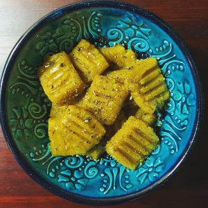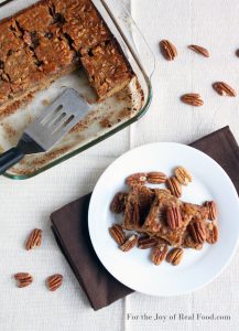 A couple of tips before you get started: Arrowroot powder is much cheaper if you can find it in 20oz bags instead of the little jars they sell in the spice department. You can purchase online here, or ask for it at your local grocery. Next, you can make the cake with fresh roasted pumpkin or the canned variety, just make sure that the cans are BPA-free and have no other ingredients (like thickeners or spices). To cook the pumpkin, slice in half, remove the seeds, and cook for 60-90 minutes at 400 degrees. I find that a 2 1/2 pound pie pumpkin yields about 3 cups of puree. Lastly, the secret ingredient here, instead of coconut is lard. I recommend rendering your own, from a pastured source of leaf lard – here is a tutorial if you have never done it before. I have made this cake using both coconut oil and lard, and it tastes good both ways – but my family and I both prefer the lard version.
