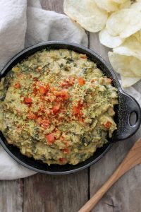 This recipe was probably one of the most challenging ones I have had in a while. I really wanted to create this dish completely free of dairy and also cashews but still give you that satisfying creamy and cheesy flavor of spinach artichoke dip. I used avocado, coconut milk and nutritional yeast to mimic the flavors of traditional artichoke dip. It took many tries but I did finally get the dip tasting exactly as I wanted. As a side note – this also tastes great on top of some shredded chicken.