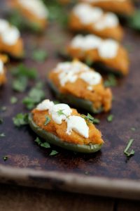 Obviously by the picture you can tell that these are not classic jalapeno poppers filled with cream cheese, battered and fried. These are roasted and stuffed with a smoky mashed sweet potato filling and topped with goat cheese.