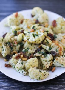 A delicious combination of roasted cauliflower, pine nuts and sultana raisins with a tangy Dijon vinaigrette. This is a great way to start a meal or can be served as a side dish, enjoy!